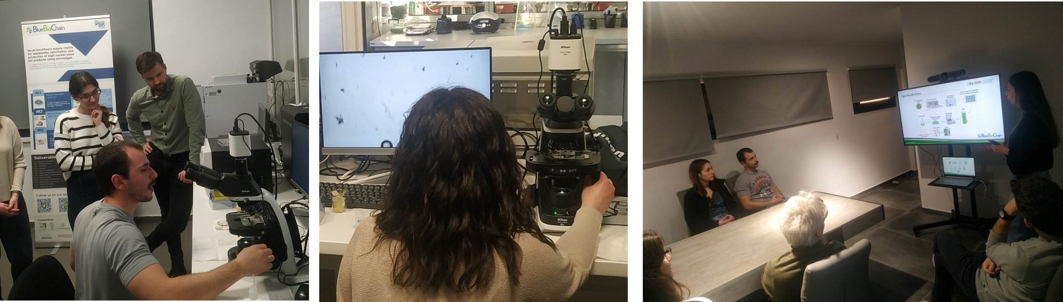 BlueBioChain members demonstrated to the students the microalgae cultivations grown in ELGO and taught them how to handle a light microscope. The students were also able to practice first-hand with microalgae sampling and imaging. Subsequently, Ms. Chrysa Anagnostopoulou gave a presentation of the overall goals of BlueBioChain, its scope and its early results.